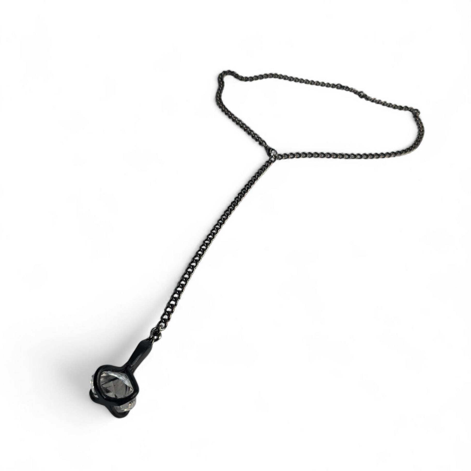 ▪︎ A Clear Quartz is facet cut into a "diamond" shape and is then set in a black clay cage setting.