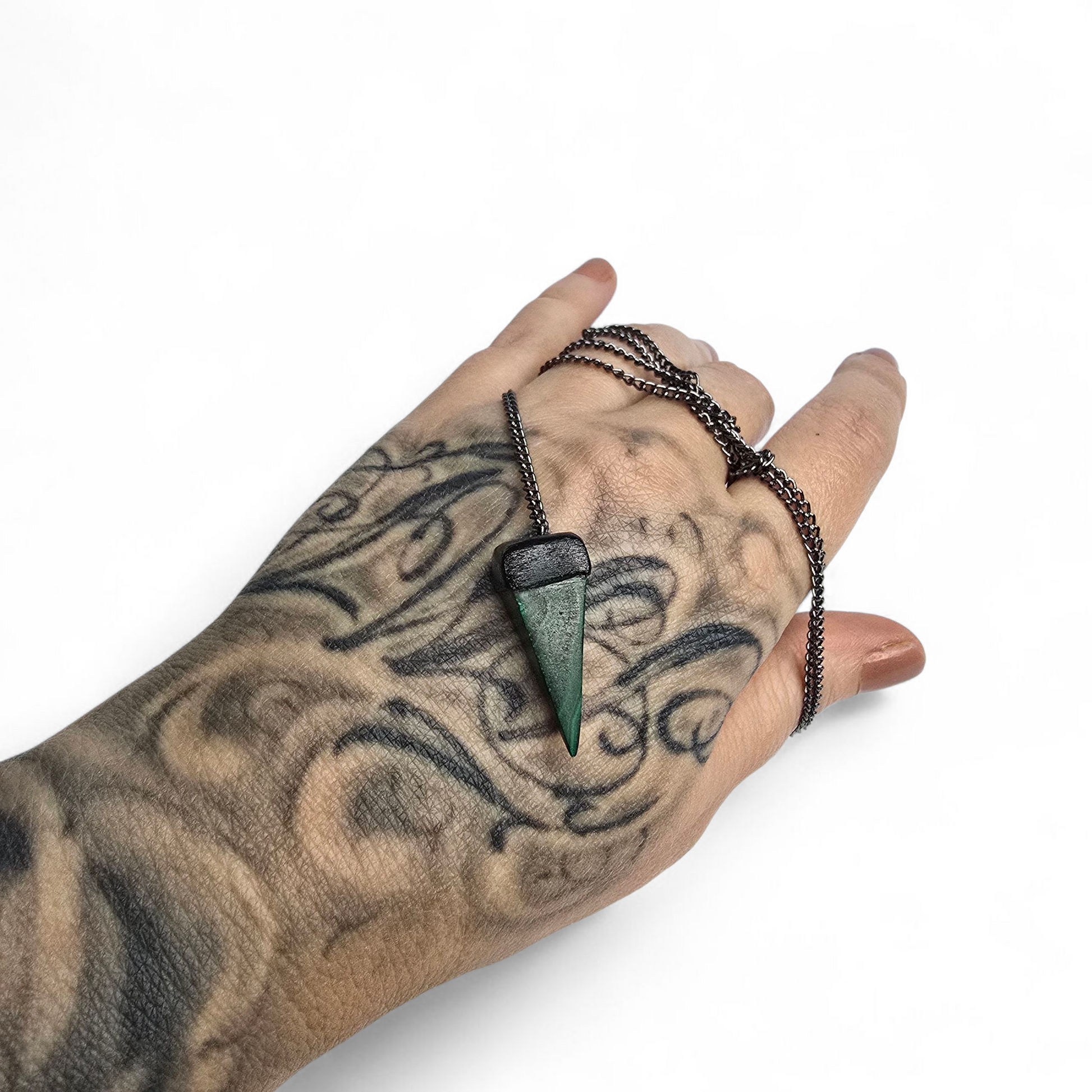 ▪︎ A cut + polished pyramid Malachite is set in a black acrylic painted clay. A minimalist but impactful design.