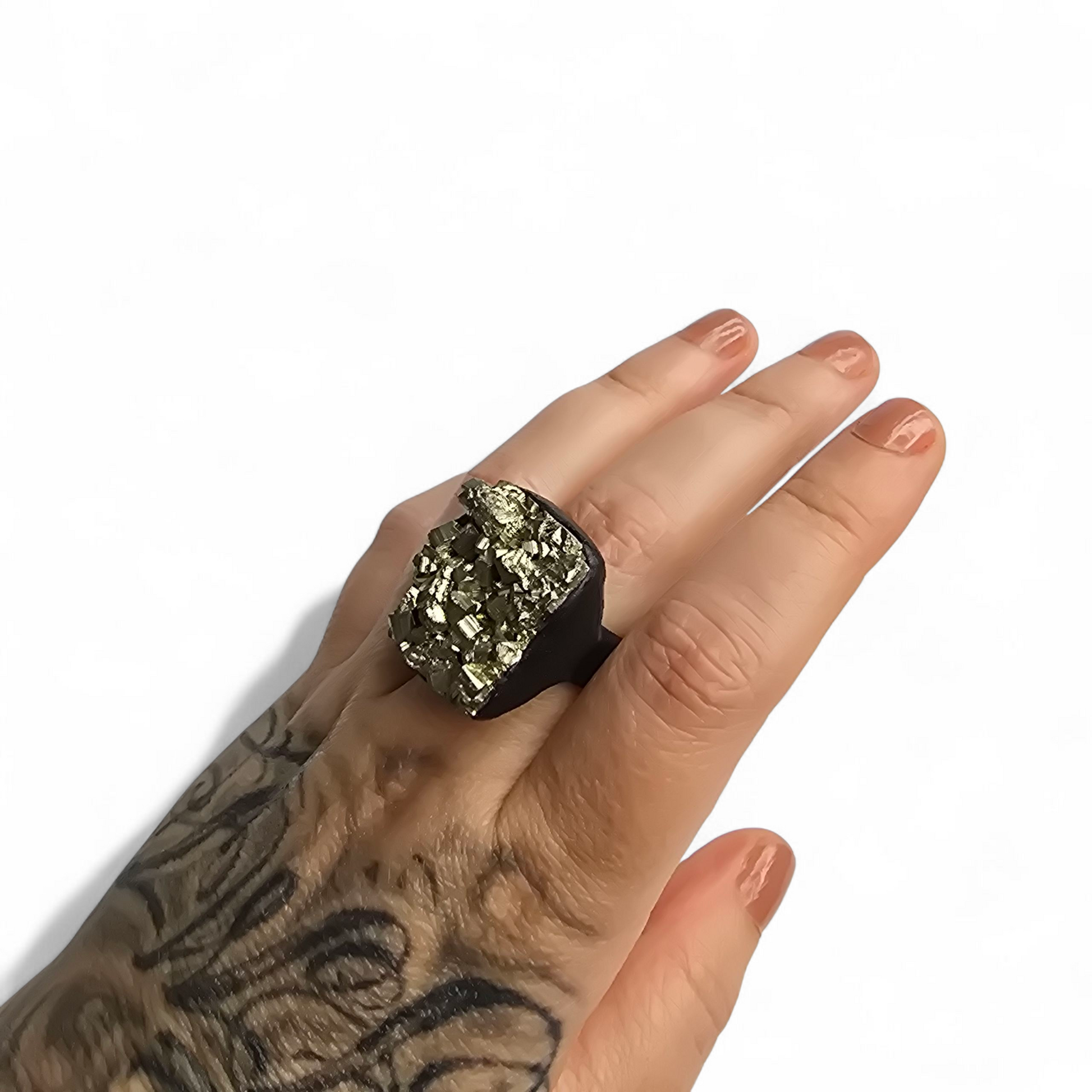 ▪︎ A flashy Pyrite cluster set in contrasting black waterproof acrylic painted clay. The silver stainless steel core is engraved with our logo.