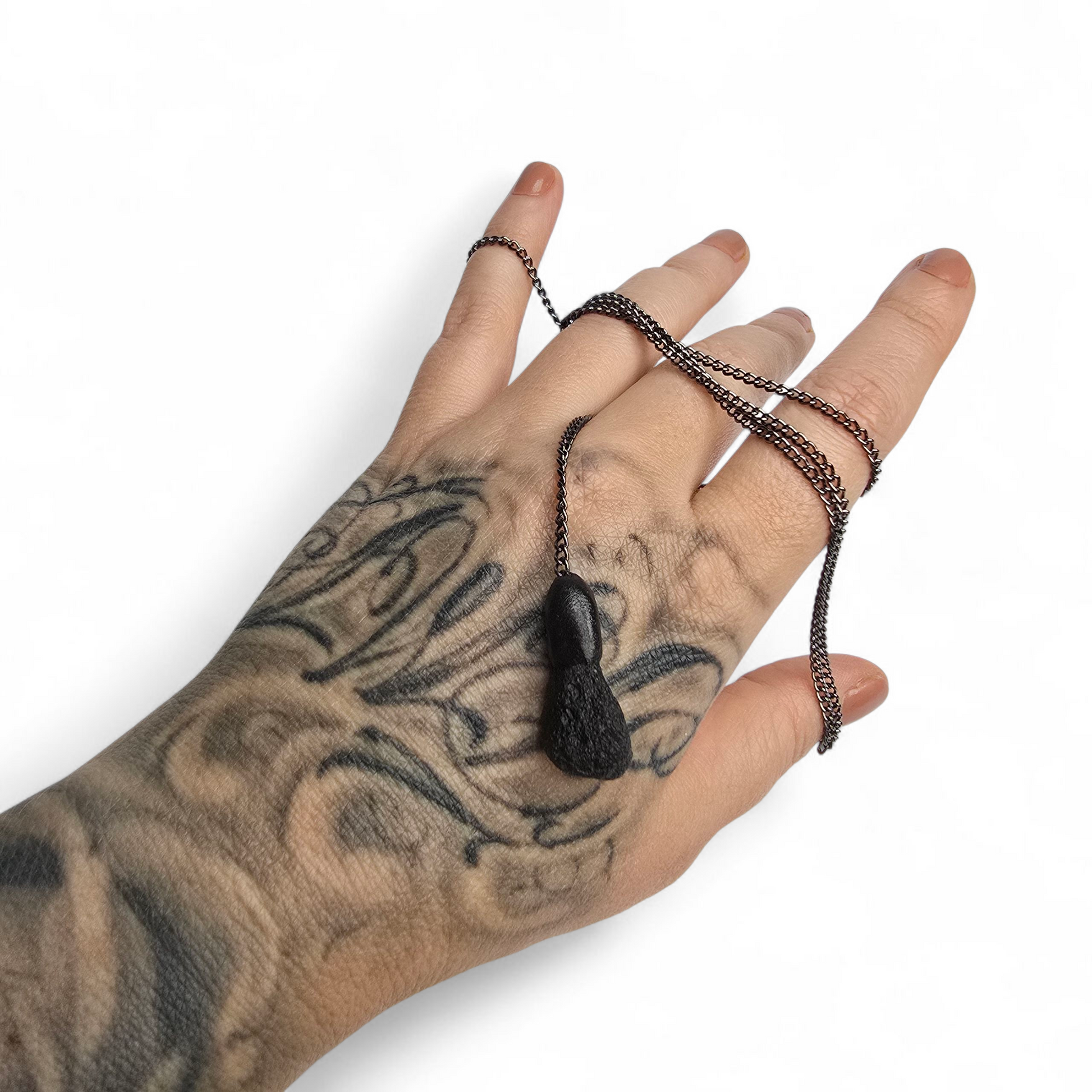 ▪︎ A Pseudo Tektite (ancient volcanic glass) occuring approx 30 million years ago. It is set in a black waterproof acrylic painted clay.
