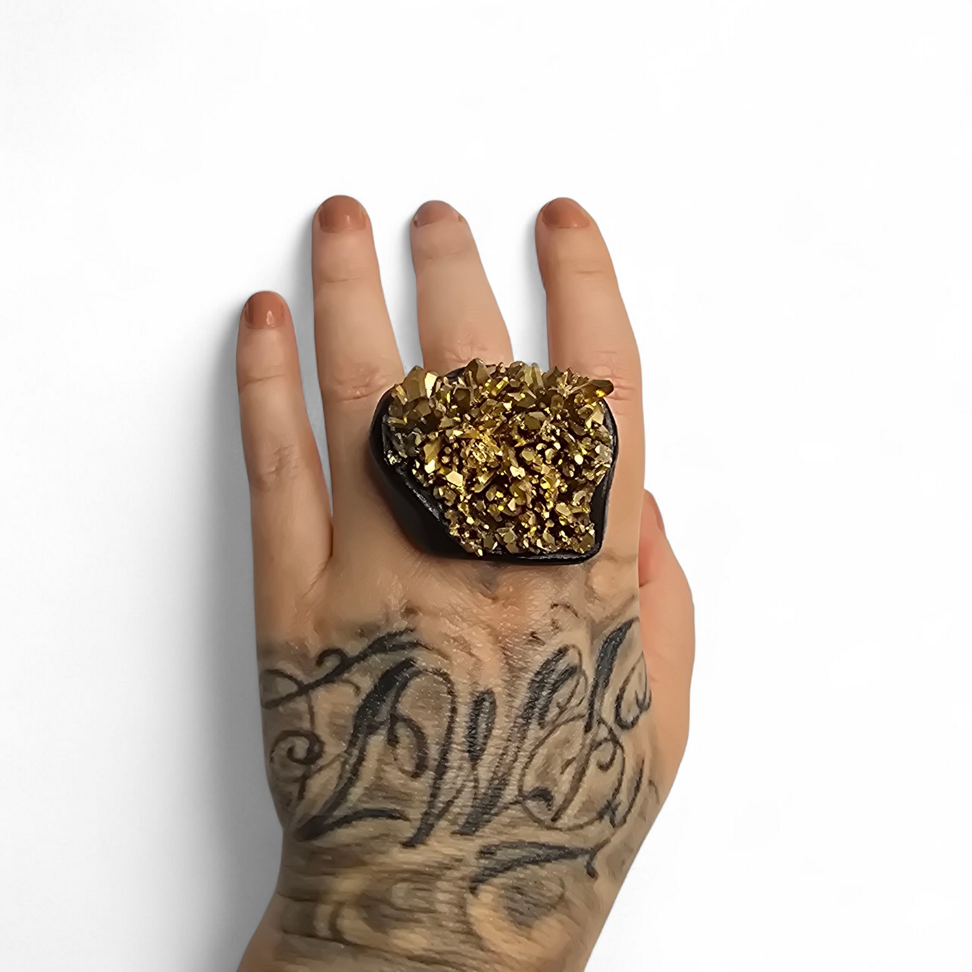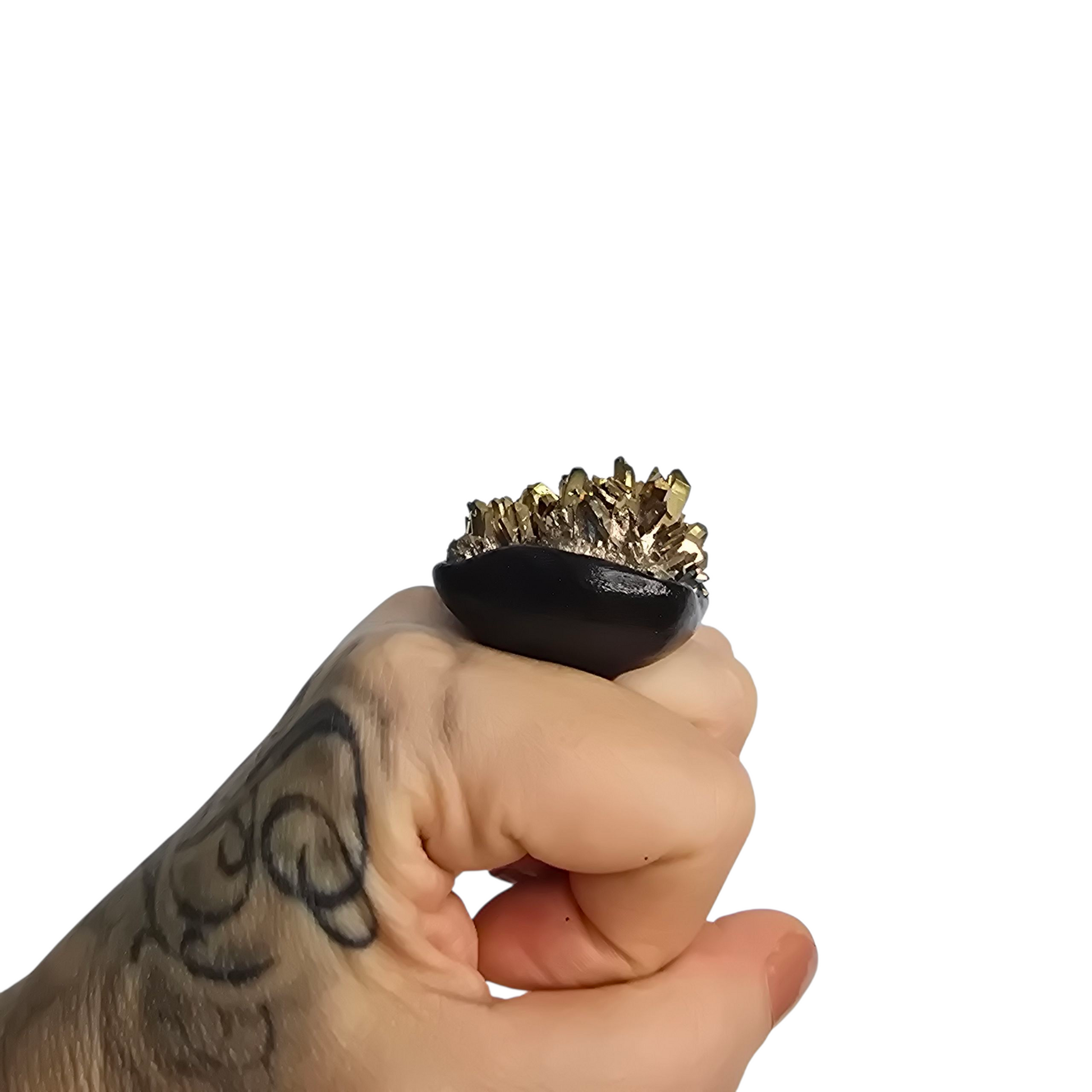 ▪︎ Gold hued Titanium bonded onto Quartz is set in a black waterproof acrylic painted clay. The silver stainless steel core is engraved with our logo.